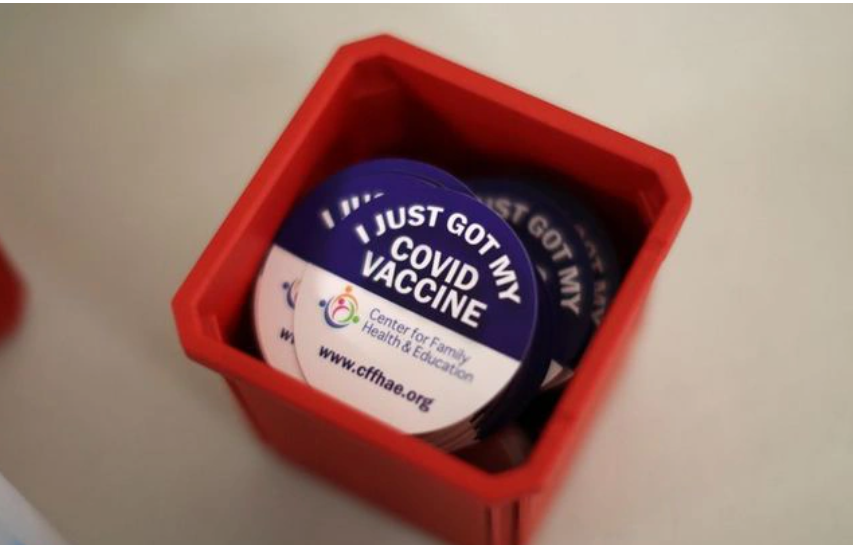 Hình dán được trao cho những người đã tiêm vaccine Covid-19. Ảnh: Reuters.