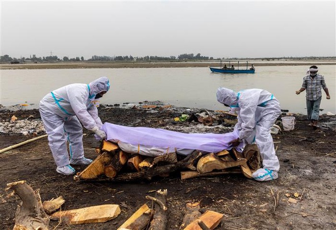 Thi thể người mắc Covid-19 ở Ấn Độ được đưa tới bờ sông để hỏa táng. Ảnh: Reuters.