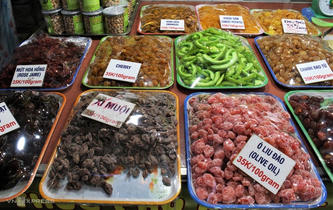 Mứt trái cây cũng xuất hiện nhiều trong chợ đêm Phú Quốc, loại này thường được bán đồng giá 35.000 đồng/100 gram, mỗi gian hàng thường có trên 15 loại mứt khác nhau cho khách lựa chọn.