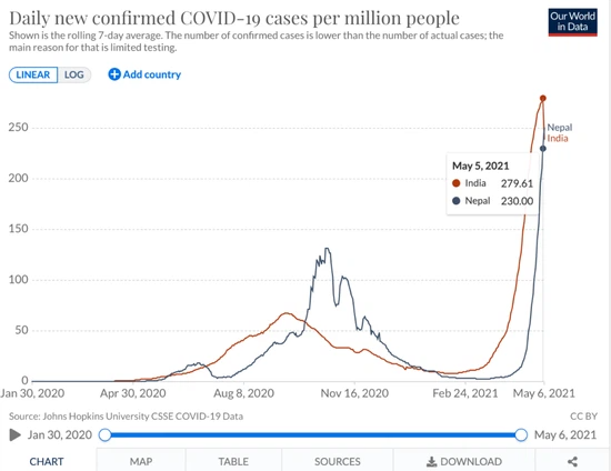 Nepal, một nước láng giềng gần gũi của Ấn Độ, cũng nổ ra đợt đại dịch Covid-19 thứ hai. So sánh với Ấn Độ thì Nepal đang gặp nhiều vấn đề nghiêm trọng hơn.
