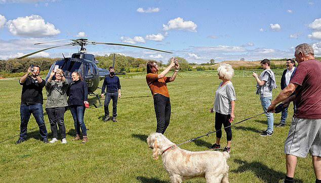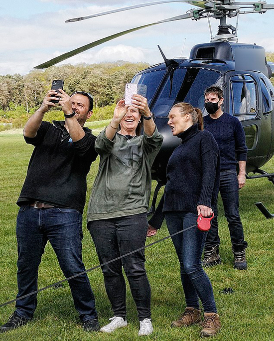 Tom Cruise lái trực thăng hạ cánh xuống đồng cỏ hôm 12/5. Tài tử Mỹ đứng nán lại bên trực thăng để chụp hình với những người dân đi dạo quanh đó.