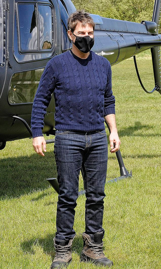 Nam diễn viên 58 tuổi phong độ trong áo len, quần jeans và đôi giày hầm hố. Anh tự lái trực thăng đến phim trường ở Yorkshire. Chiếc trực thăng này cũng là "đạo cụ" trong bộ phim. Ngôi sao phim hành động Hollywood có bằng lái máy bay từ lâu và thường tự mình thực hiện cảnh trên không trong loạt phim "Impossible".
