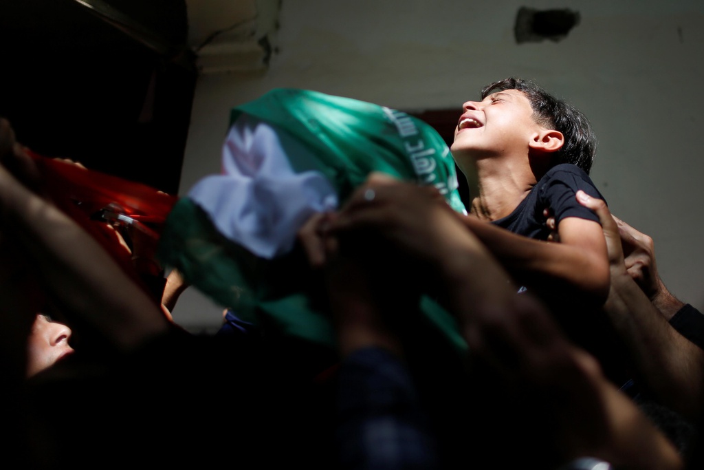 Một cậu bé Palestine khóc khi người thân đưa xác anh trai đi chôn cất. Ảnh: Reuters.