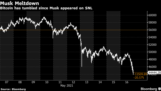 Đà giảm giá của bitcoin từ sau khi Musk xuất hiện trên truyền hình.