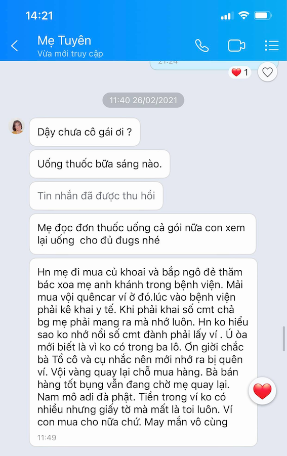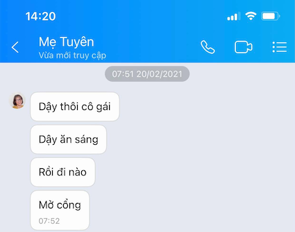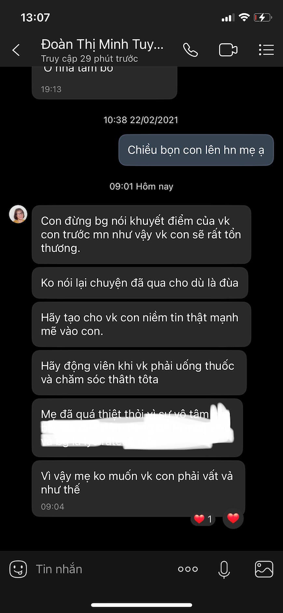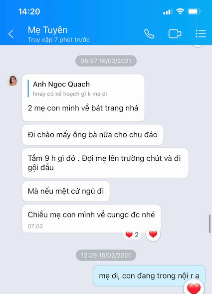 Hôm nào cũng nhắn tin hỏi thăm, r chỉ bảo mình cách quan tâm mọi người trong họ. Rồi chỉ mình ăn chay niệm phật, phóng sinh hướng về những điều tốt đẹp nữa. Nhiều hôm về Hải Phòng, lên thì mẹ khóc, khóc nhiều lắm, bảo chồng mình lên cũng đc nhưng mình ở lại với mẹ.