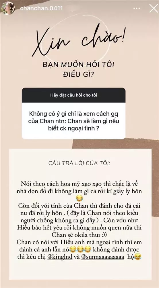 Cụ thể, 10X nhận được câu hỏi: "Trang sẽ làm gì nếu biết chồng ngoại tình?". Không trốn tránh, cô trả lời rất vô tư: "Nói theo cách hoa mỹ thì chắc là về nhà dọn đồ, không làm gì cả rồi kí giấy ly hôn. Còn đối với tính của Chan thì đánh cho đã rồi ly hôn (đây là Chan nói theo kiểu người chồng không ra gì đấy).