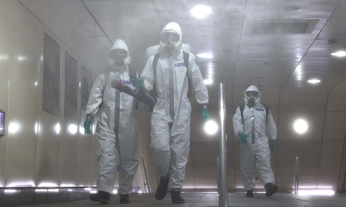 Binh sĩ Đài Loan khử trùng một ga tàu điện ngầm ở Đài Bắc hôm 25/5. Ảnh: Reuters.