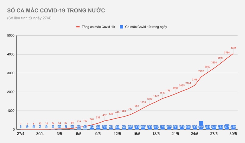 Đến nay, Việt Nam có tổng cộng 5.604 ca ghi nhận trong nước và 1.503 bệnh nhân nhập cảnh. Số lượng ca mắc mới tính từ 27/4 đến nay là 4.034.