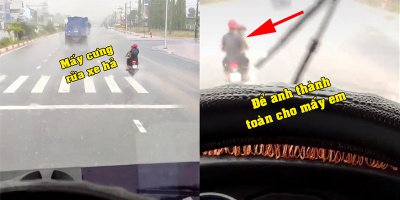 Thấy vậy, tài xế xe tải mới bật cười thích thú và cố tình đi vào vũng nước tiếp theo để nước bắn vào hai người họ. Thực hiện xong hành động, thấy người đi xe máy ngó lên nhìn mình, tài xế cười hả hê: “Để anh thành toàn cho các em.”