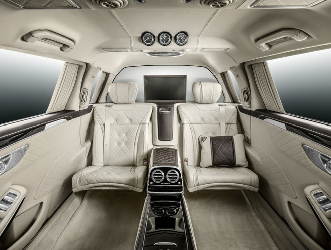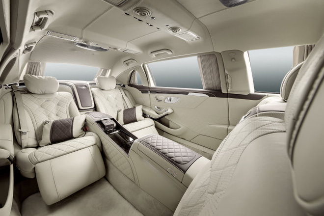 Thêm vào đó, khoang sau chiếc Mercedes-Maybach S600 Pullman còn có hai ghế gấp, cửa sổ trời có thể đổi màu, tủ lạnh, bàn làm việc cá nhân. Đặc biệt, ghế "ông chủ" có thể ngả tới 43,5 độ và có bệ đỡ chân, đảm bảo sự thoải mái tuyệt đối cho chủ nhân của chiếc xe.