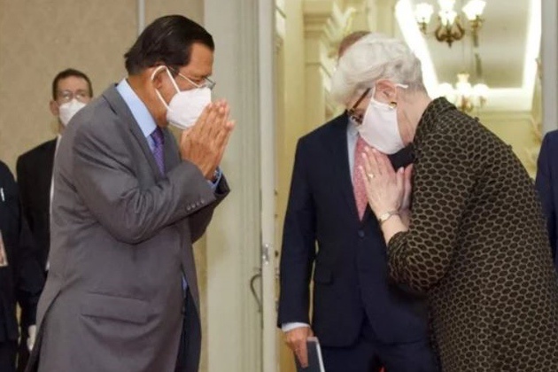 Thủ tướng Campuchia Hun Sen (trái) và Thứ trưởng Bộ ngoại giao Mỹ Wendy Sherman trong buổi gặp ngày 1/6. Ảnh: AFP.