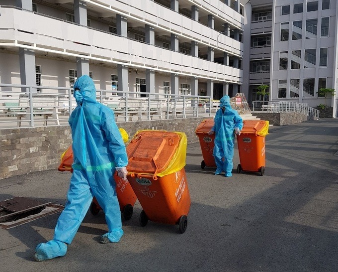 Nhân viên công ty Môi trường Đô thị TP HCM thu gom rác thải tại một khu cách ly tập trung. Ảnh: Lan Thương.