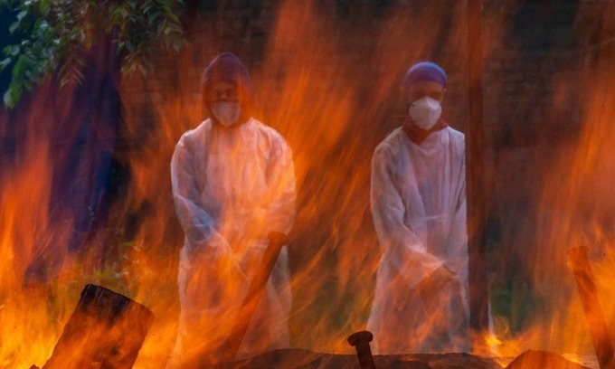 Gia đình một bệnh nhân tử vong vì Covid-19 tại lò hỏa táng ở thành phố Srinagar, Ấn Độ, hôm 25/5. Ảnh: AP.