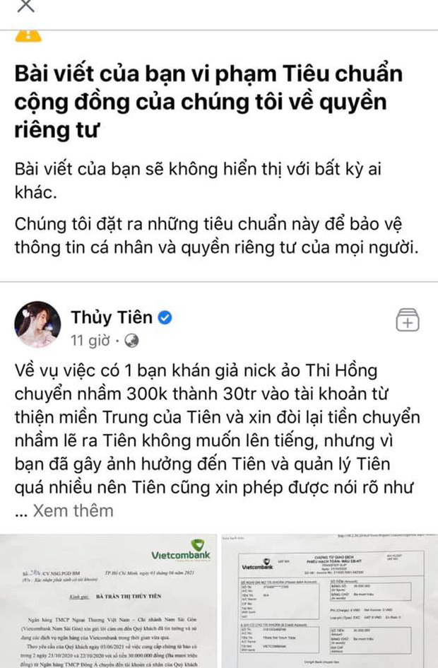 Hình ảnh do Thuỷ Tiên cung cấp chứng minh bài viết bị Facebook gỡ bỏ