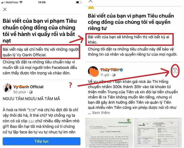 Cách đây không lâu, ca sĩ Vy Oanh cũng từng bị Facebook gỡ bỏ bài viết do vi phạm tiêu chuẩn cộng đồng. Những hình ảnh chứng minh bị Facebook gỡ bỏ bài viết cũng được nữ ca sĩ đăng tải. Nếu so sánh giữa hai hình ảnh này, bạn sẽ thấy những chứng cứ được cư dân mạng đưa ra là hoàn toàn hợp lý.