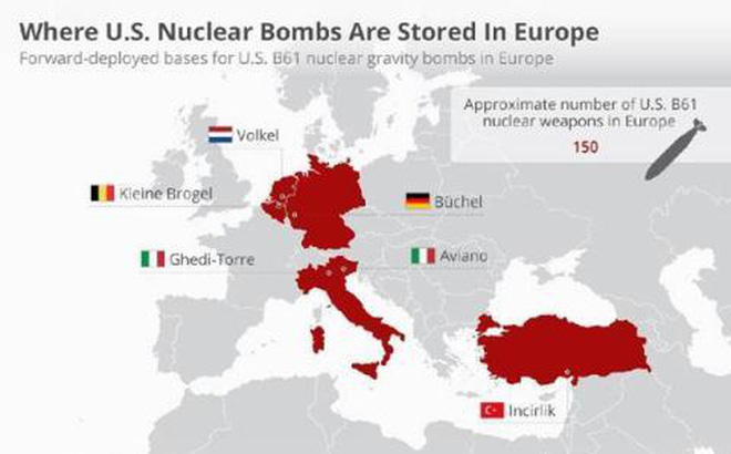 "Mỹ đang lưu trữ hơn 150 vũ khí hạt nhân tại 6 căn cứ ở châu Âu gồm Kleine Brogel (Bỉ), Buchel (Đức), Aviano và Ghedi-Torre (Italy), Volkel (Hà Lan) và Incirlik (Thổ Nhĩ Kỳ)", thượng nghị sĩ Canada Joseph Day viết trong báo cáo được Ủy ban An ninh và Quốc phòng thuộc Hội đồng Nghị viện NATO công bố hồi tháng 4/2019.