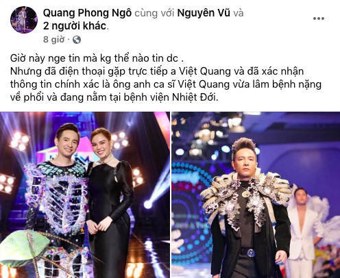 Người mẫu Ngô Quang Phong thì chia sẻ rằng: "Giờ nghe tin mà không thể nào tin được. Nhưng tôi đã điện thoại gặp trực tiếp anh Quang và được xác nhận anh bệnh nặng về phổi, nằm điều trị ở viện".