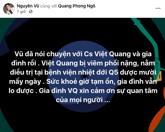 Ca sĩ Nguyên Vũ đã liên lạc với gia đình Việt Quang để cập nhật tình hình mới nhất và thông báo: "Vũ đã nói chuyện với ca sĩ Việt Quang và gia đình rồi.