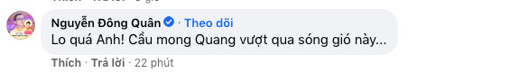 Dưới phần bình luận, ca sĩ Đông Quân viết: "Lo quá anh, cầu mong Quang vượt qua sóng gió này".