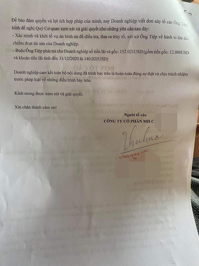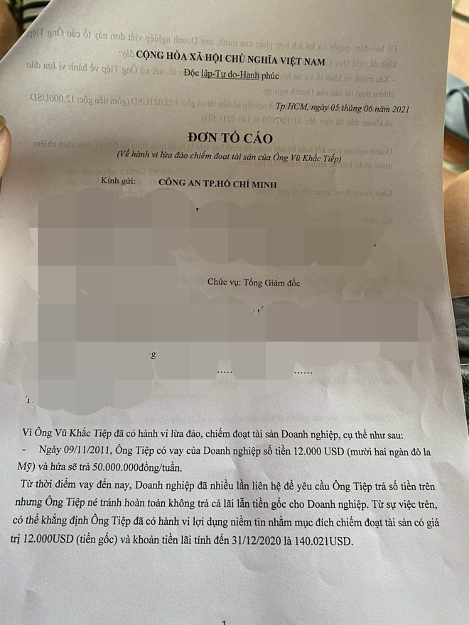 Cụ thể, những người này cho biết họ được uỷ quyền mang đơn tố cáo sự việc Vũ Khắc Tiệp “lừa đảo, chiếm đoạt tài sản doanh nghiệp” với số tiền 12.000 USD được vay từ ngày 9/11/2011 và cho đến 31/12/2021 khoản gốc và lãi lên tới 140.021 USD.