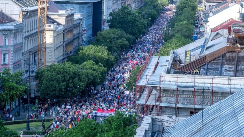 Người biểu t́nh tụ tập trước ṭa nhà quốc hội Hungary ở Budapest trước bài phát biểu của thị trưởng thành phố