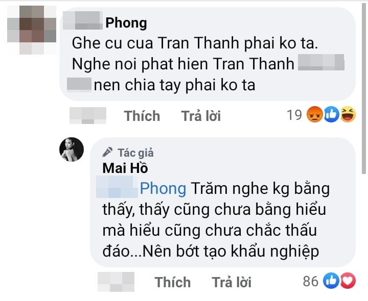 Trước bình luận nhạy cảm, Mai Hồ đáp trả gay gắt: "Trăm nghe không bằng thấy, thấy cũng chưa bằng hiểu, mà hiểu cũng chưa chắc thấu đáo. Nên bớt tạo khẩu nghiệp".