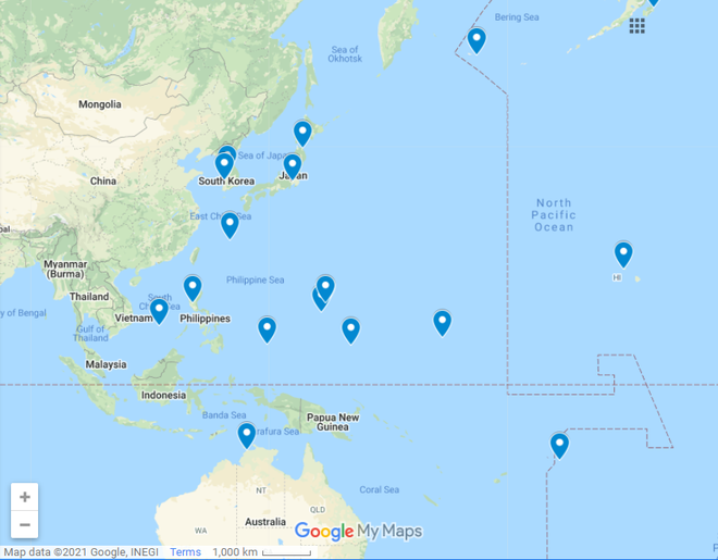 Trong bản đồ là một số căn cứ không quân của Mỹ ở khu vực Tây Thái Bình Dương, bên cạnh các căn cứ chính ở Nhật Bản và Guam.