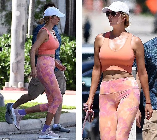 Ivanka nổi bật trên phố khi mặc bộ đồ tập, gồm áo bra và quần legging, bó sát màu hồng đào. Cô đội mũ lưỡi trai màu trắng và kính đen để che chắn trước cái nắng 31 độ C, đồng thời đi giày thể thao sáng màu trẻ trung.