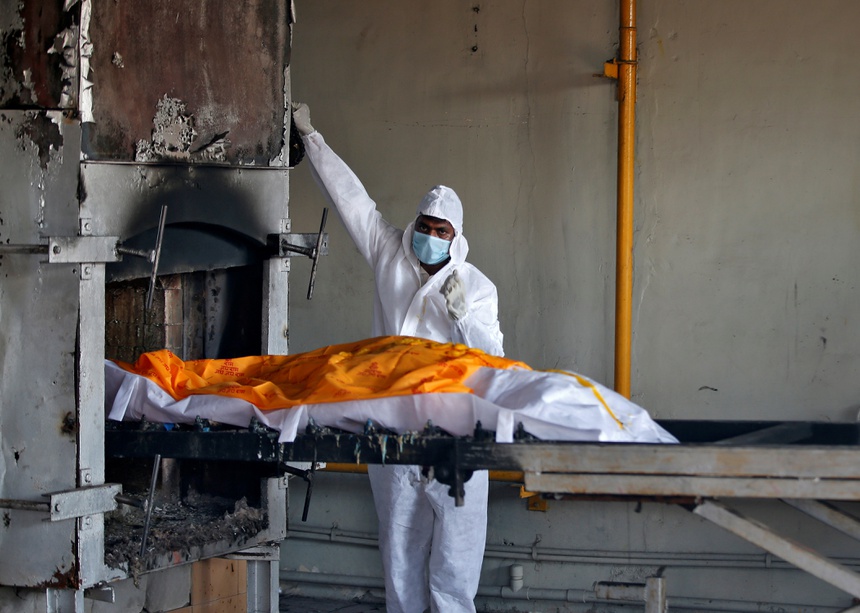 Một công nhân chuẩn bị hỏa thiêu thi thể của một nạn nhân Covid-19. Ảnh: Reuters.
