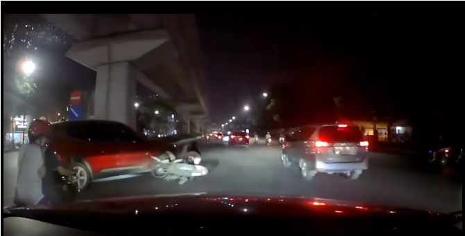 Khi đến đoạn đường giao nhau, xe này gặp ôtô màu đỏ đang quay đầu nên không xử lý kịp. Cả nhóm tông vào hông ôtô và ngã xuống đường. Xe gắn camera hành trình di chuyển chậm nên phanh kịp. Vụ va chạm không gây thiệt hại về người, hai xe bị hư hỏng nhẹ.