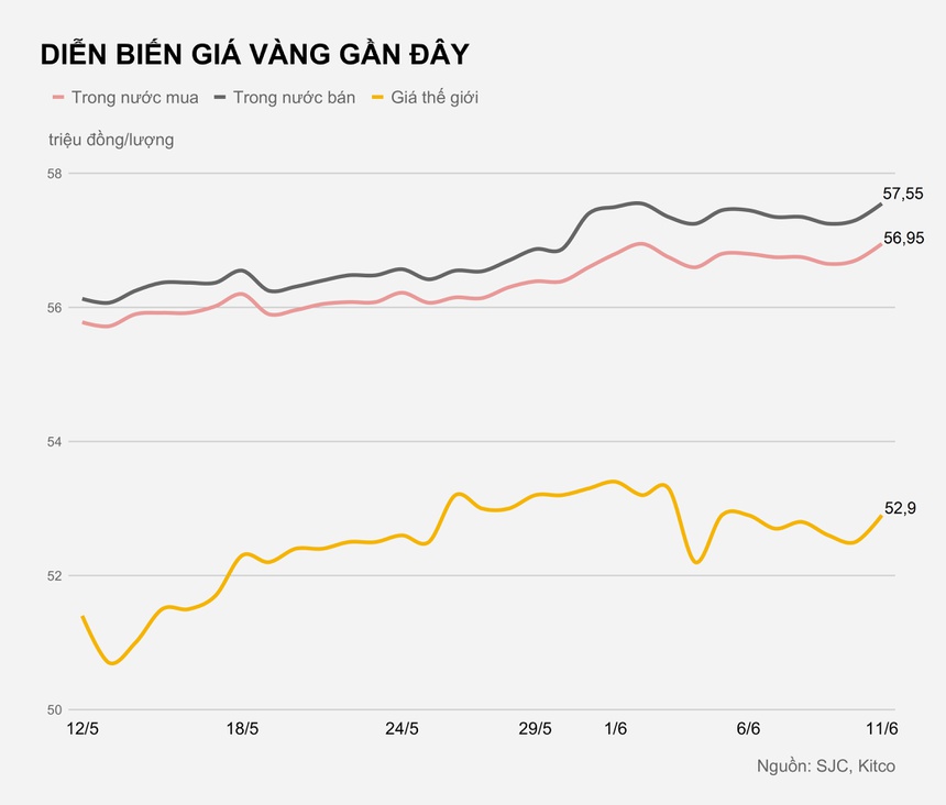 Cụ thể, Công ty TNHH MTV Vàng bạc Đá quý Sài Gòn (SJC) sáng nay niêm yết giá vàng miếng khu vực TP.HCM ở mức 56,95 - 57,55 triệu đồng/lượng (mua vào - bán ra), tăng 250.000 đồng so với cuối ngày 10/6. Nếu so với cùng giờ sáng, giá tại đây đã tăng tới 350.000 đồng.