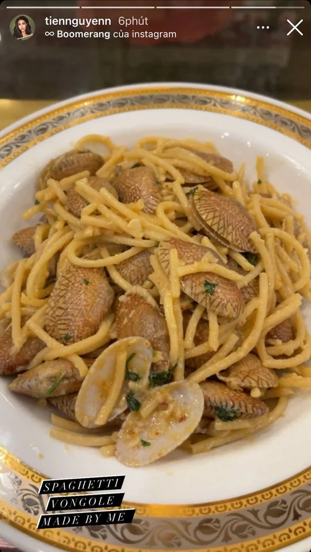 Không để cư dân mạng đợi lâu, hôm nay đẹp trời nên cuối cùng Tiên Nguyễn cũng đã chịu trưng trổ tài nấu ăn của mình lên mạng xã hội. Trong story vừa đăng tải, Tiên Nguyễn khoe sương sương món mỳ Ý với ngao kèm sốt khiến bất cứ chiếc bụng đang đói nào cũng phải réo vang. "Đầu bếp" Tiên Nguyễn còn cẩn thận thêm dòng "made by me" để nhận diện thương hiệu.