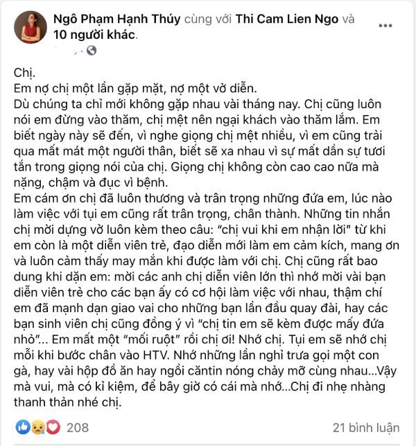 Diễn viên Hạnh Thúy đau lòng khi nói về kỷ niệm với người chị đặc biệt: "Em nợ chị một lần gặp mặt, nợ một vở diễn. Dù chúng ta chỉ mới không gặp nhau vài tháng nay. Chị cũng luôn nói em đừng vào thăm, chị mệt nên ngại khách vào thăm lắm. Em biết ngày này sẽ đến, vì nghe giọng chị mệt nhiều, vì em cũng trải qua mất mát một người thân, biết sẽ xa nhau vì sự mất dần sự tươi tắn trong giọng nói của chị. Giọng chị không còn cao cao nữa mà nặng, chậm và đục vì bệnh..."