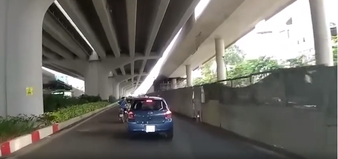 Tài xế ôtô phải giảm tốc độ nhường đường. Ngay sau đó, lái xe tăng tốc vượt lên phía trước, ép xe máy vào sát lô cốt bên lề đường để "dằn mặt" rồi nhấn ga bỏ đi.
