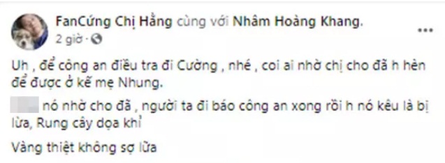 Gần đây, dân tình được dịp dậy sóng trước vụ lùm xùm của ca sĩ Phi Nhung, con nuôi Hồ Văn Cường và Nhâm Hoàng Khang - IT nhận được 1 tỷ của bà Nguyễn Phương Hằng. Theo đó, nam IT đã đứng ra đòi lại công bằng cho Hồ Văn Cương khi cho rằng nam ca sĩ bị bóc lột, chiếm cát xê. Tuy nhiên, Hồ Văn Cường đã lên tiếng xin lỗi, tố ngược IT Nhâm Hoàng Khang và một fan lâu năm cấu kết khiến nhiều người hoang mang.