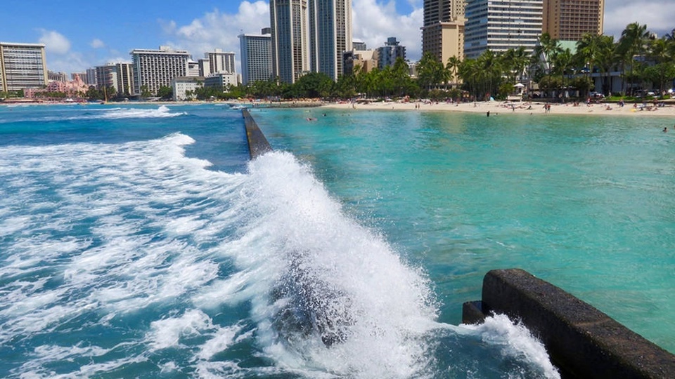 Kuhio Beach, Hawaii, Mỹ: Khu vực Waikiki của Hawaii nổi tiếng là nơi lướt sóng hàng đầu thế giới. Trên bãi biển Kuhio rực rỡ, du khách có thể trải nghiệm bơi lội trong một đê chắn sóng được gọi là "Bức tường Waikiki". Tường chắn này dài khoảng 400 m, tạo ra một đầm phá nhiệt đới nhân tạo quyến rũ bên những dãy nhà cao tầng. Ảnh: Shutterstock.