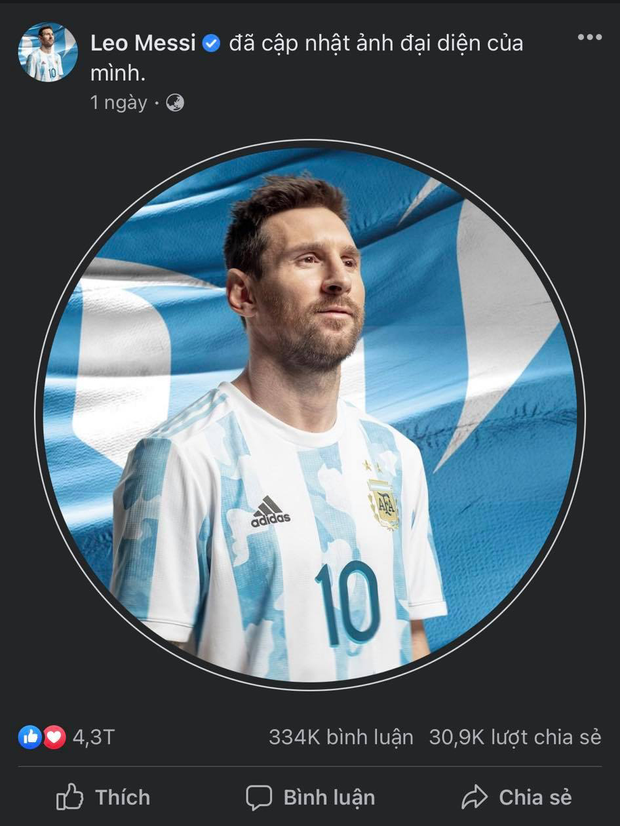 Trên trang Facebook cá nhân với 101 triệu người theo dõi, Leo Messi đã chính thức xác lập kỷ lục Guinness mới với hơn 4,3 triệu lượt react avatar trong vòng 24h. Đây là bức ảnh đại diện sở hữu lượng like khủng nhất trong vòng 24h, vượt qua kỷ lục của cựu Tổng thống Mỹ Obama với hơn 3,8 triệu.