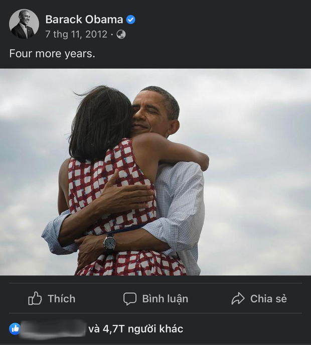 Trước đó, kỷ lục này thuộc về Tổng thống Mỹ Barack Obama, theo kỷ lục Guinness ghi nhận thì bức ảnh được đăng tải vào ngày 1/12/12012 với caption "Four more years" (Tạm dịch: 4 năm nữa) của ông Obama đã thu về hơn 3,8 triệu lượt react trong vòng 24h.