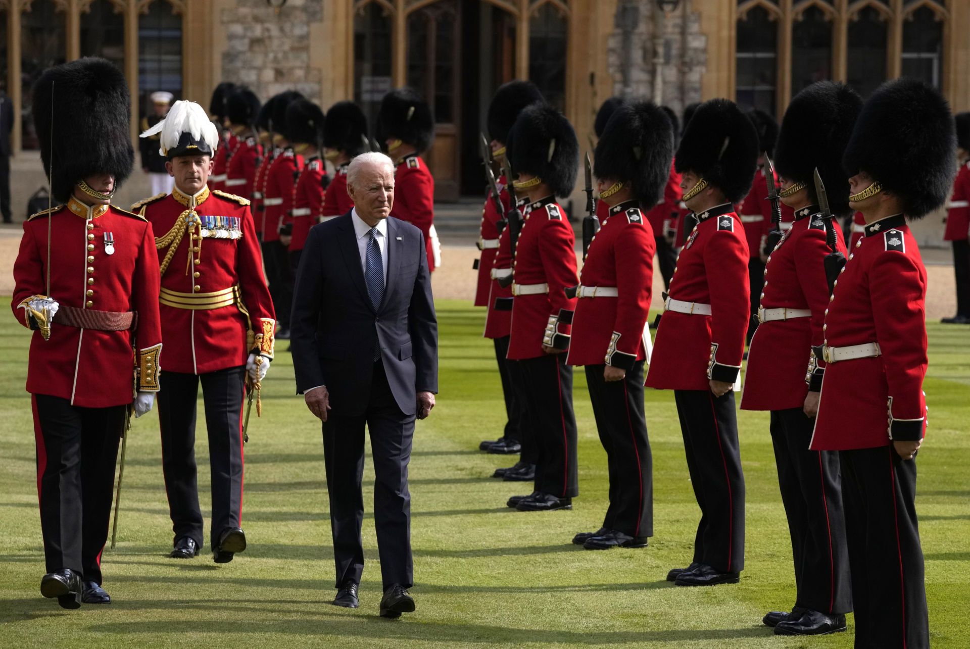 Tổng Thống Joe Biden duyệt Ngự Lâm Quân Hoàng Gia tại lâu đài Windsor hôm Chủ Nhật, 13 Tháng Sáu. (Hình: Matt Dunham – WPA Pool/Getty Images)