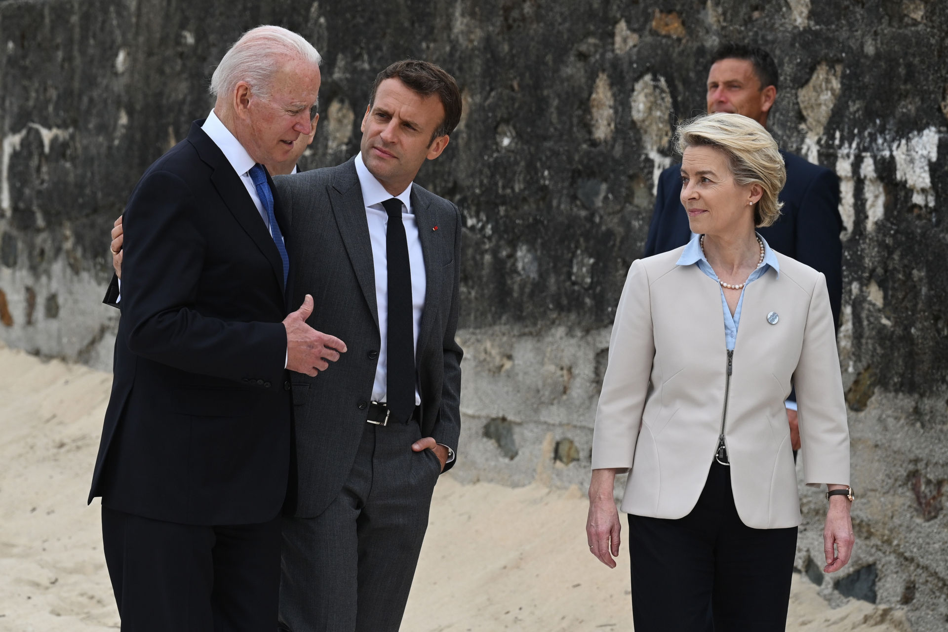 Sự thân mật của các nhà lãnh đạo, Tổng Thống Pháp Macron quàng vai trò chuyện với Tổng Thống Biden và Nữ Chủ Tịch Uỷ Ban Châu Âu Ursula von der Leyen (phải). (Hình: Leon Neal – WPA Pool/Getty Images)