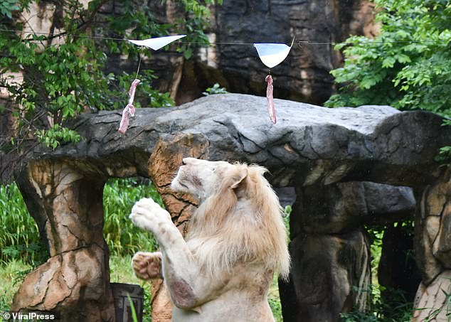Sư tử Boy dự đoán bằng cách nhảy lên vồ lấy miếng thịt đầu tiên.