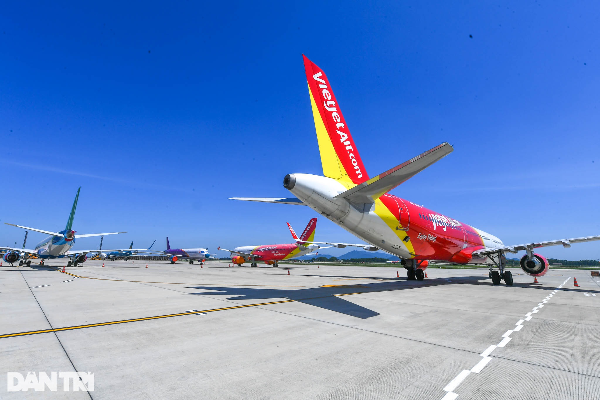 PV Dân trí có mặt tại khu bay Nội Bài và ghi nhận toàn bộ khu vực sân đỗ tàu bay, đường lăn, đường cất-hạ cánh với nền bê tông hấp thụ nhiệt trên diện rộng nóng như trong lòng chiếc chảo rang khổng lồ.