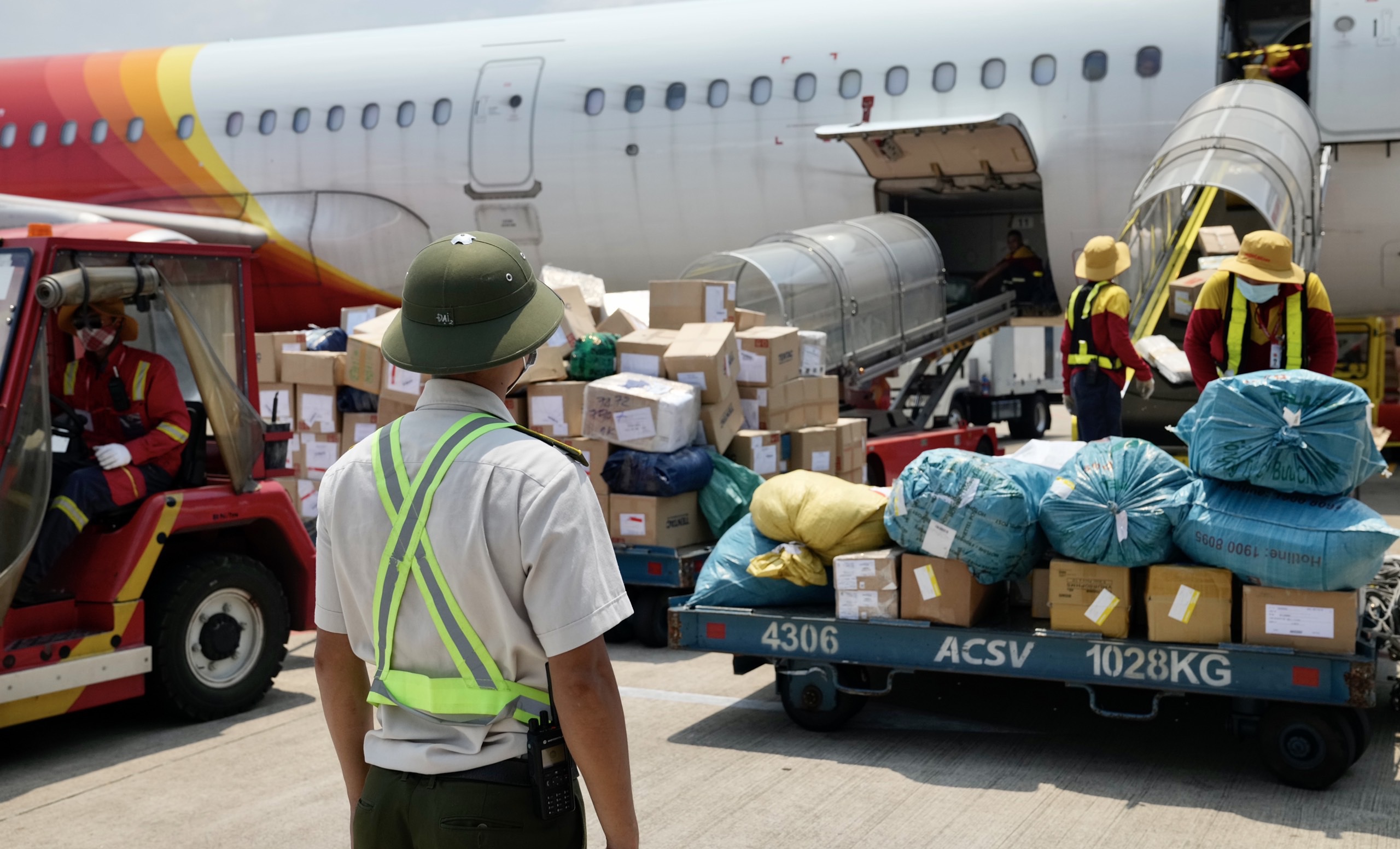 Kiểm tra, giám sát hoạt động bốc xếp hàng hóa đối với nhân viên phục vụ tàu bay (Ảnh: Phan Công).