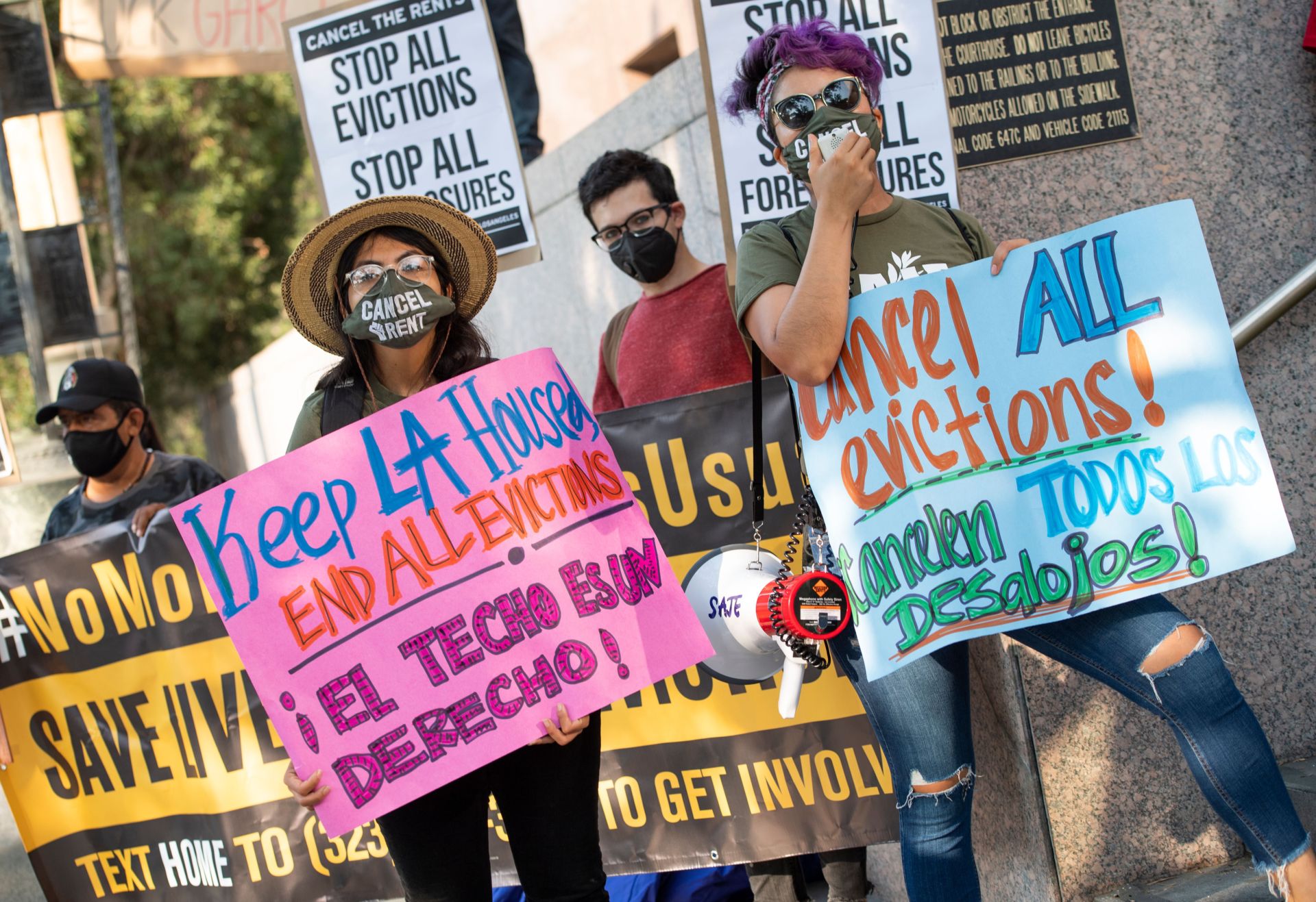 Tranh đấu đ̣i ngưng thu tiền nhà và không đuổi nhà ở Los Angeles, California. (H́nh minh họa: Valerie Macon/AFP via Getty Images)