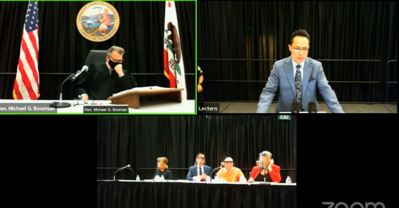 Phụ Tá Biện Lư Thiên Hồ (phải) tại phiên ṭa trực tuyến truy tố kẻ giết người hàng loạt Joseph James DeAngelo. (H́nh: Chụp từ màn h́nh Zoom)