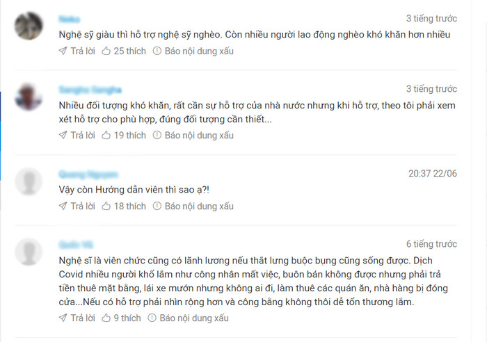 Bên cạnh đó, một số ý kiến còn cho rằng nên tập trung hỗ trợ những nghệ sĩ có hoàn cảnh khó khăn, neo đơn, thất nghiệp do dịch bệnh trước rồi sao đó mới tới các đối tượng tiếp theo.