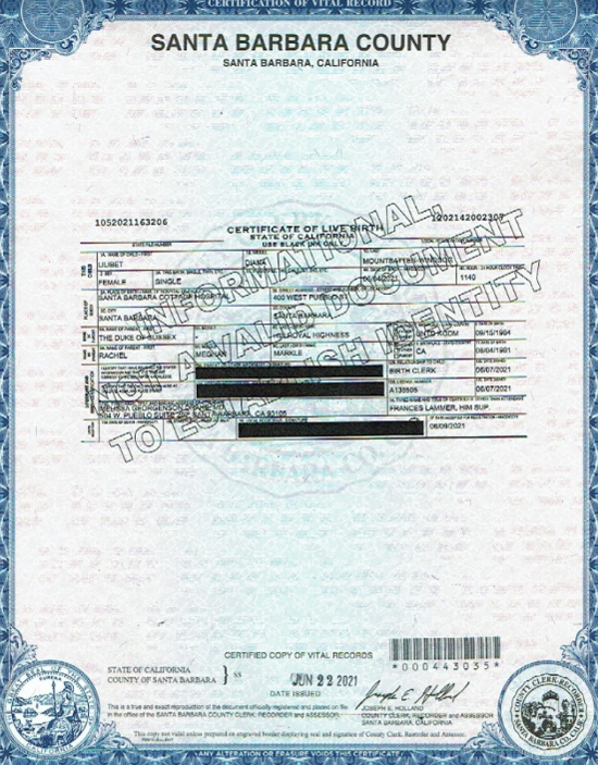 Hôm 24/6, một bản sao giấy khai sinh của con thứ hai nhà Sussex được làm tại hạt Santa Barbara đã bị rò rỉ. Theo đó, tước hiệu HRH (His Royal Highness) của Harry được liệt kê trong phần họ và Duke of Sussex (Công tước xứ Sussex) được ghi trong phần tên.