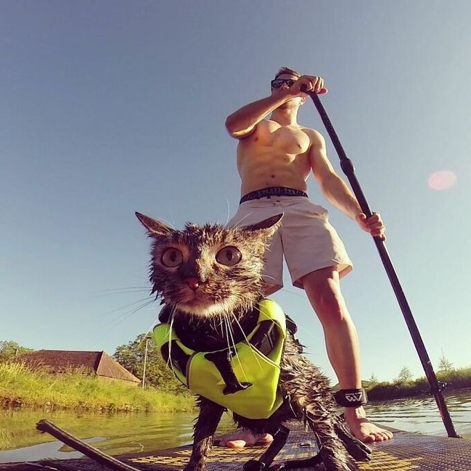 Là một chú mèo dũng cảm, Cathode còn trải nghiệm một số môn thể thao như chèo SUP.