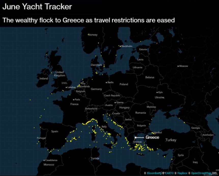 Theo Bloomberg, Hy Lạp đang dẫn đầu bảng xếp hạng siêu du thuyền với ít nhất 194 chiếc neo đậu tại các cảng tính tới ngày 25/6, tăng gần 80 chiếc so với tháng trước.
