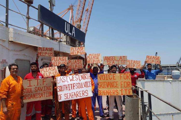 Thuyền viên tàu Ula biểu tình. Ảnh: thenewsminute